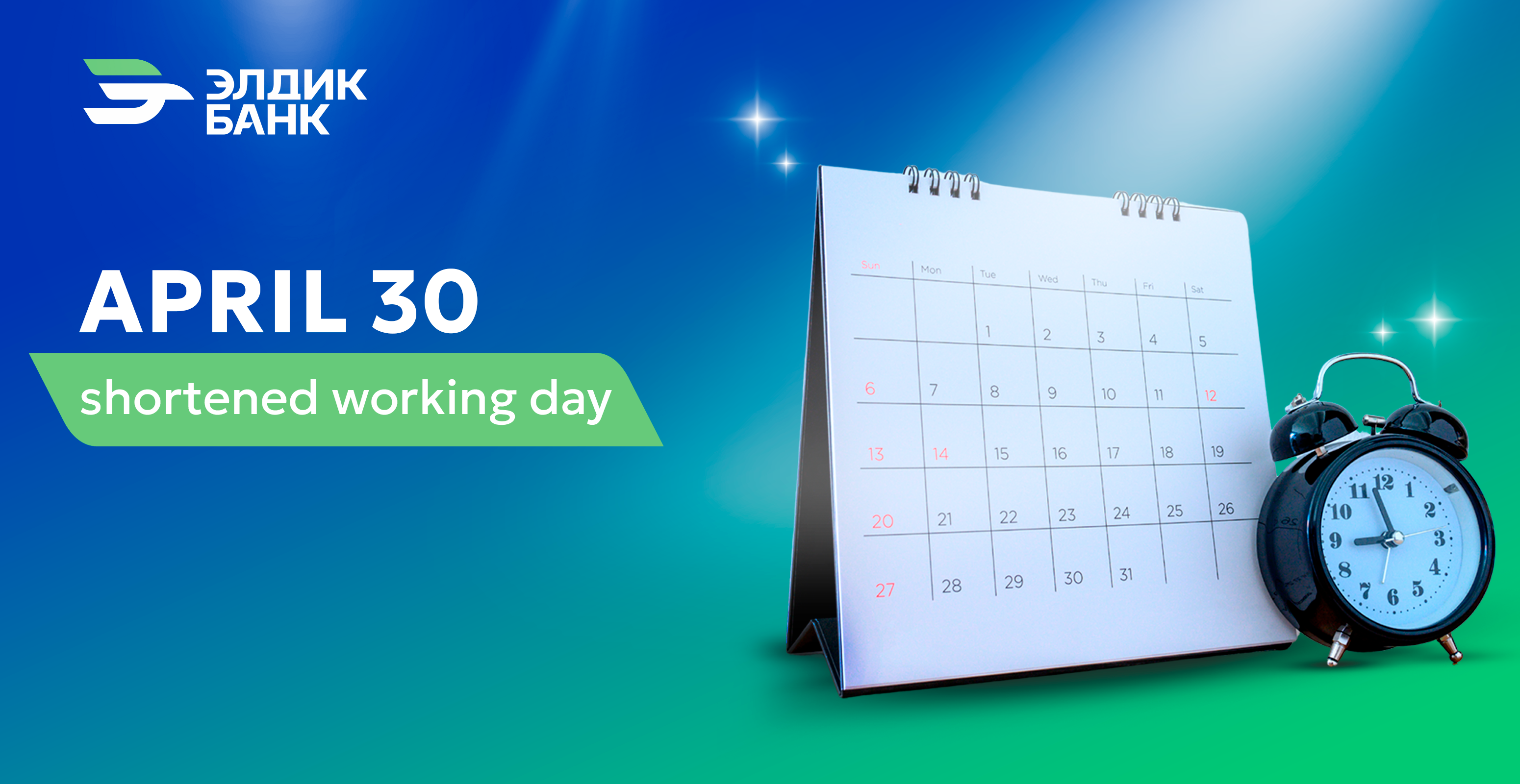 Eldik Bank OJSC informs that on April 30, 2025, all branches and offices will operate on a 1-hour shorter working schedule.
