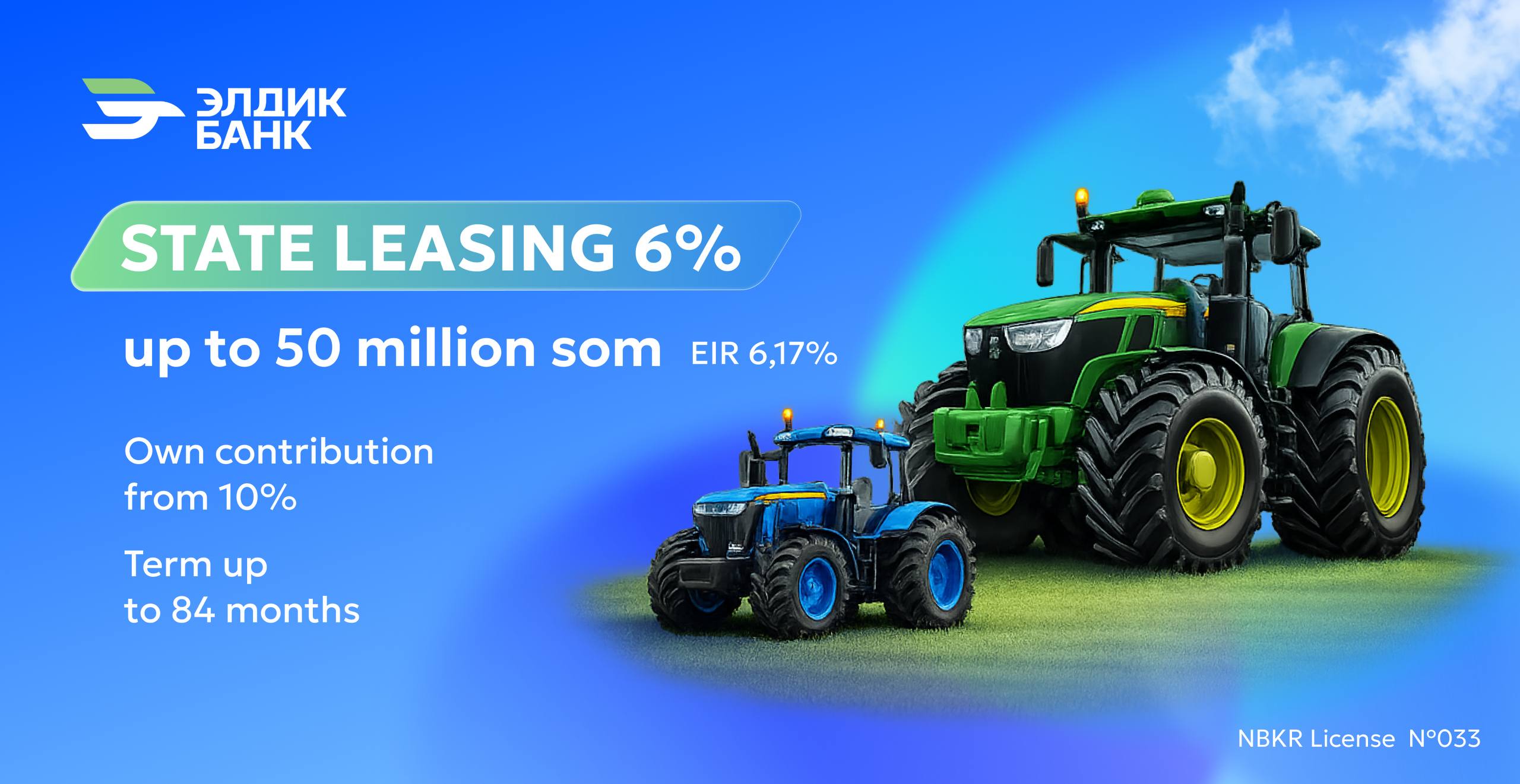 Eldik Bank is launching a new preferential leasing, Gosleasing, to help you grow confidently and invest in machinery, equipment and development. Conditions of the Gosleasing program: