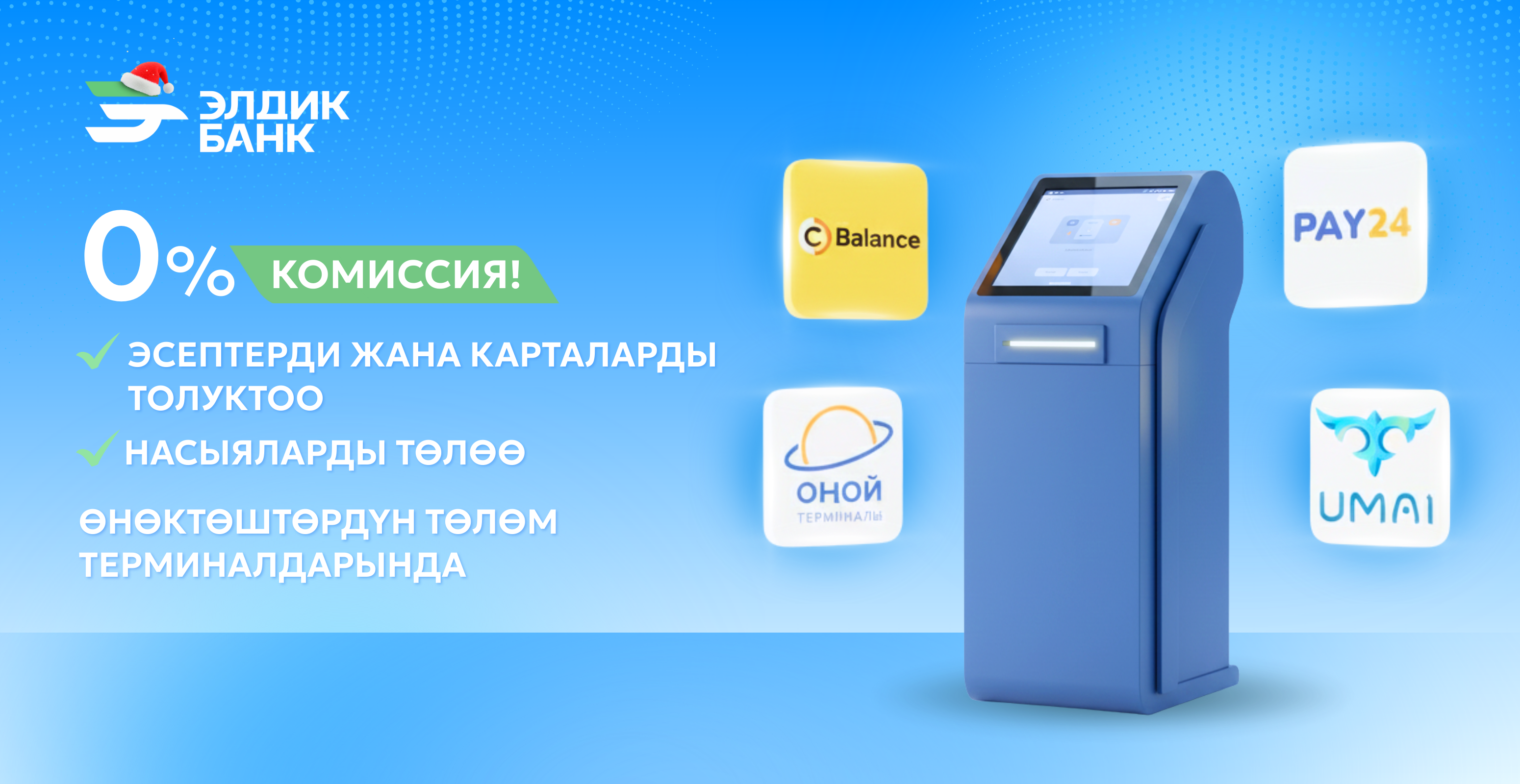 Эми Balance, Pay24, Umai жана Оңой төлөм терминалдарында эсептерди жана карталарды толуктоо, кредиттерди төлөө 0% комиссия менен жүргүзүлөт.