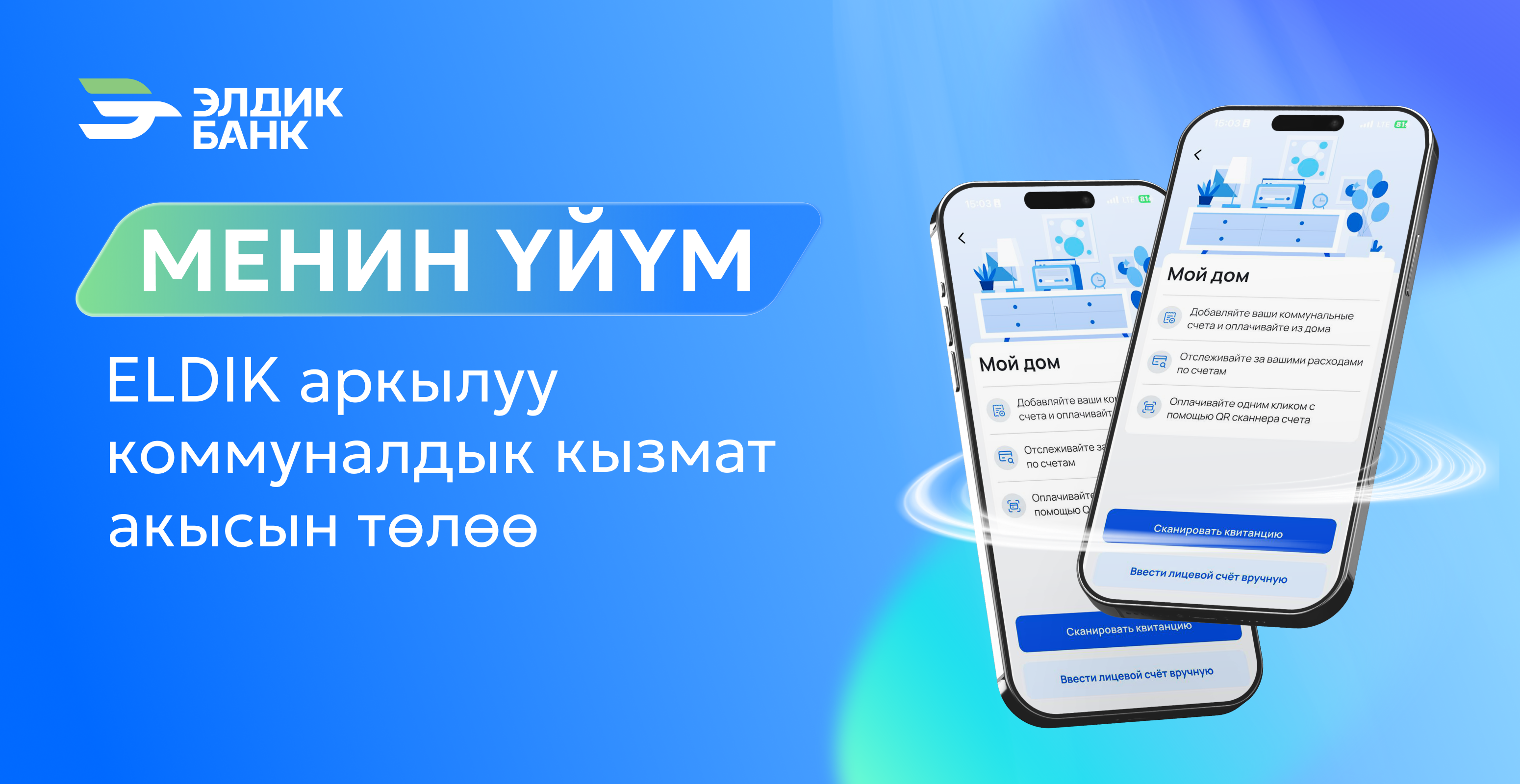 Eldik мобилдик банкындагы “Менин үйүм” бөлүмү аркылуу коммуналдык төлөмдөрдү төлөңүз — квитанциядагы QR-кодду сканерлеп.