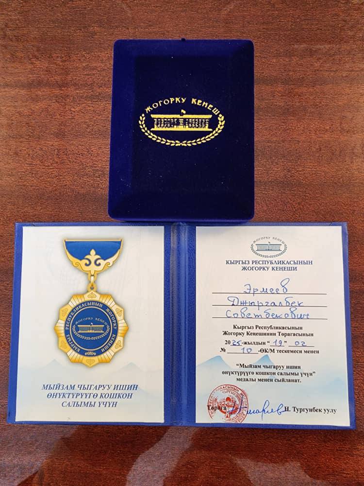 В Жогорку Кенеше Кыргызской Республики состоялось вручение наград за вклад в развитие законодательной деятельности. Государственную награду получили Председатель Совета директоров ОАО «Элдик Банк» Джыргалбек Эрмеев и Председатель Правления Уланбек Ногаев.