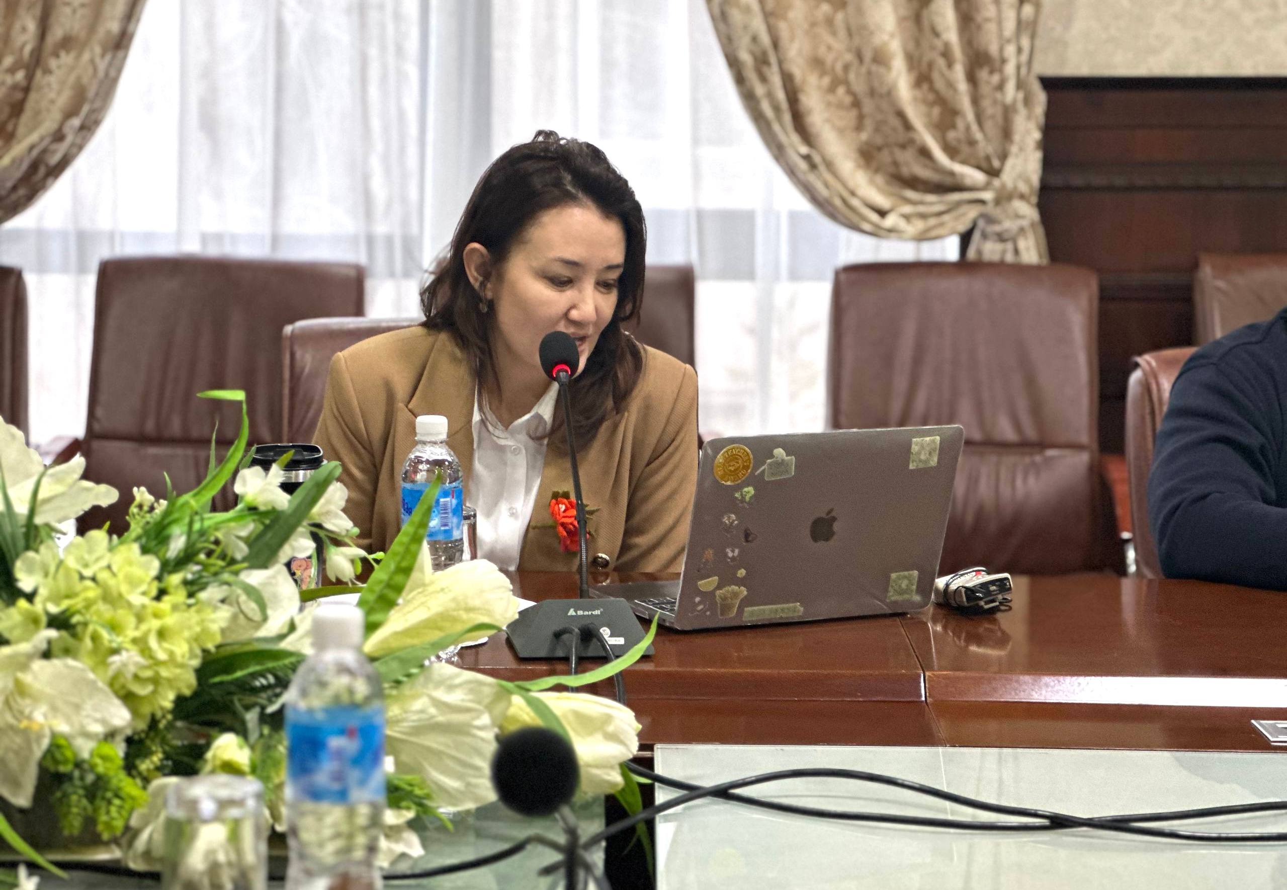 Банк атынан гендер жана инклюзия боюнча менеджер Жылдыз Абдылдаева Гендердик теңчилик саясаты боюнча презентацияны сунуштады. Ал банктын тең мүмкүнчүлүктөрдү илгерилетүү жана коопсуз эмгек чөйрөсүн түзүү боюнча негизги ыкмаларын тааныштырды.
